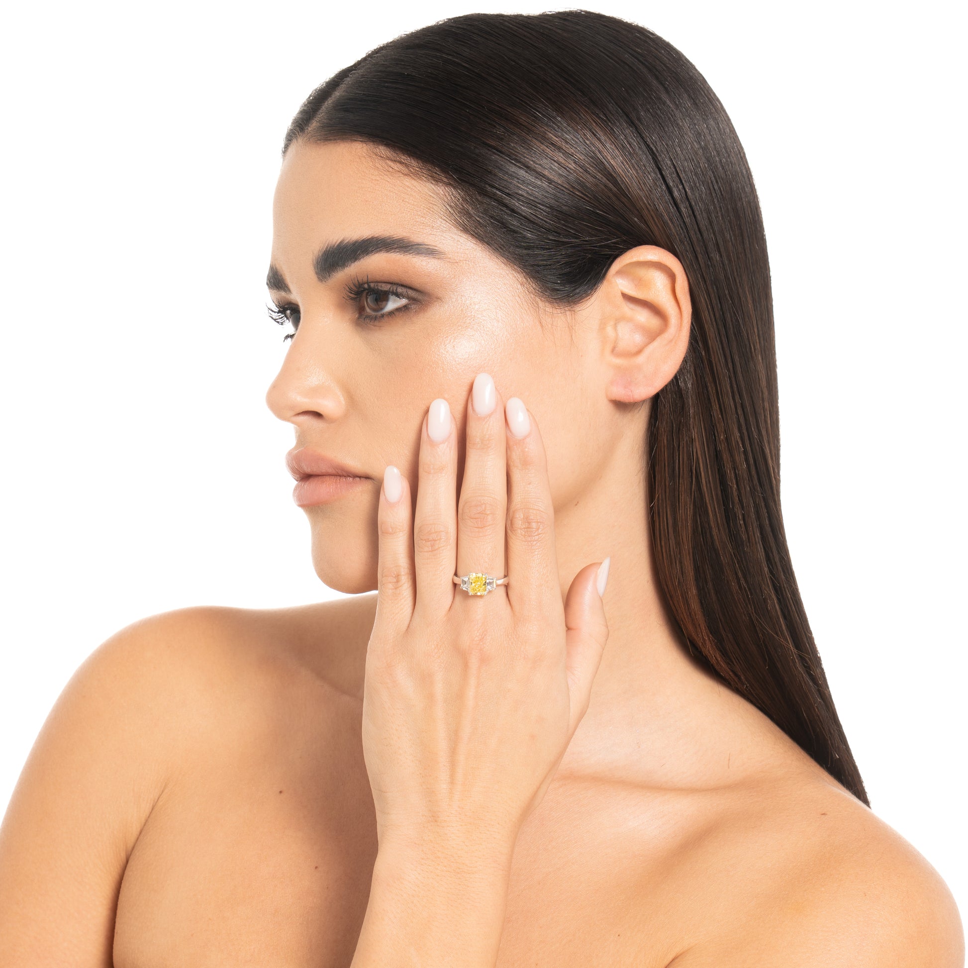 Anello con Diamante centrale lab grown Fancy Yellow Vivid taglio Radiant di Ct. 1.62 purezza VVS1 con 2 diamanti laterali taglio trapezio Colore E Purezza VVS peso totale Ct. 0.81